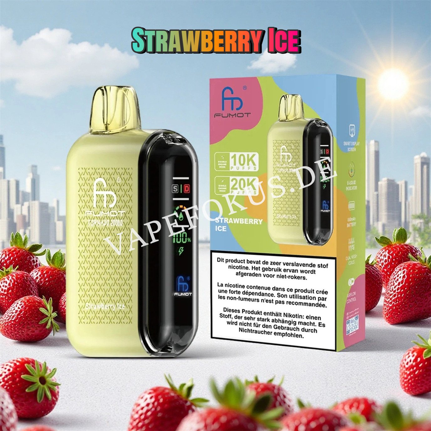 - Jede Fumot Tornado 20000 Strawberry Ice E-Zigarette bietet bis zu 20000 Züge.